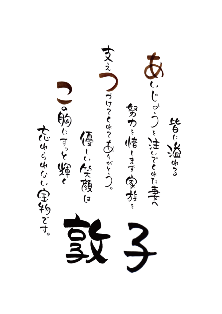 あわただしい葬儀の中で、少し立ち止まって故人さまの在りし日のお姿が私たちが作る名前の詩で再現できればと考えています。また、ご遺族の方々の心の中にある「感謝の気持ち」を少しでも織り込めればとも考えています。