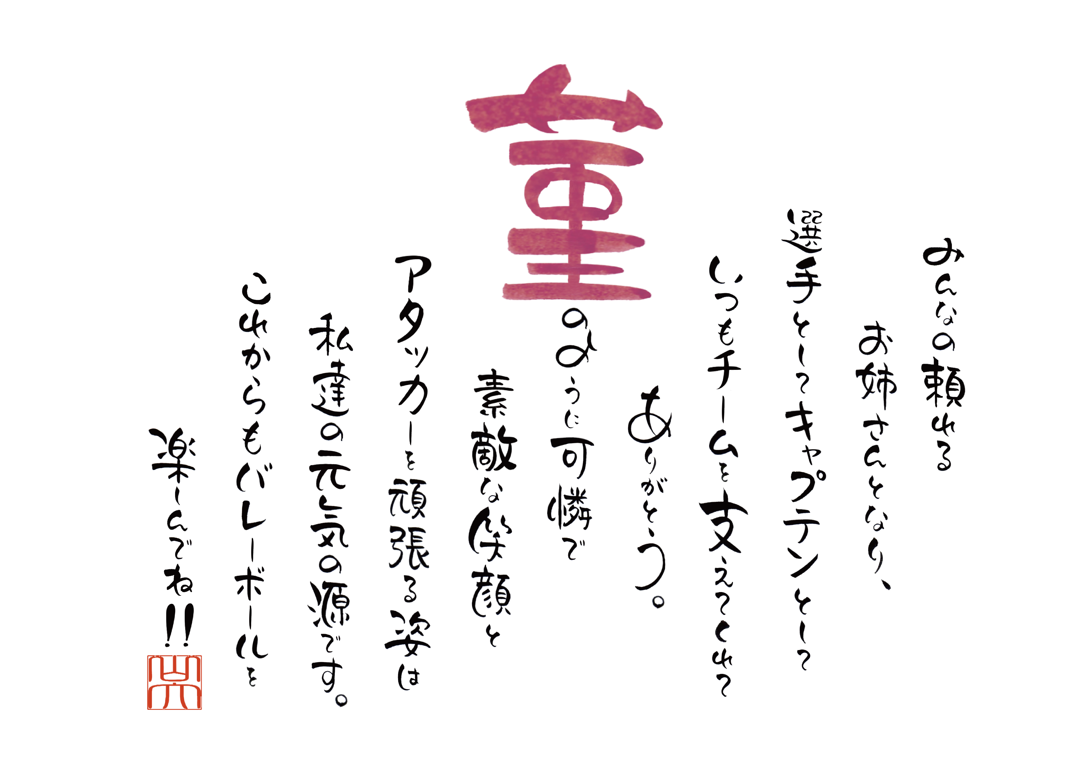 性格はキャプテンをしているということもありまして、みんなから頼られるお姉さん的な存在です。あとは笑顔が素敵です。こんな感じで大丈夫でしょうか?ポジションは主にアタッカーです。 名前の詩 #卒部 #記念 データ送信 よかったらシェアしてね! URLをコピーしました! 手元供養品として 米寿のお祝い 関連記事 米寿のお祝い 2023年7月5日 手元供養品として 2023年7月5日 命名紙! 2023年6月19日